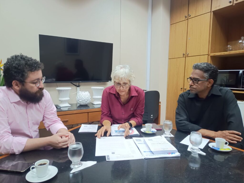 Participaram da reunião Denise Carneiro e o Sandro Sales, pelo Sindjufe-BA, e o assessor da Presidência, Gustavo França, representando o TRT5.